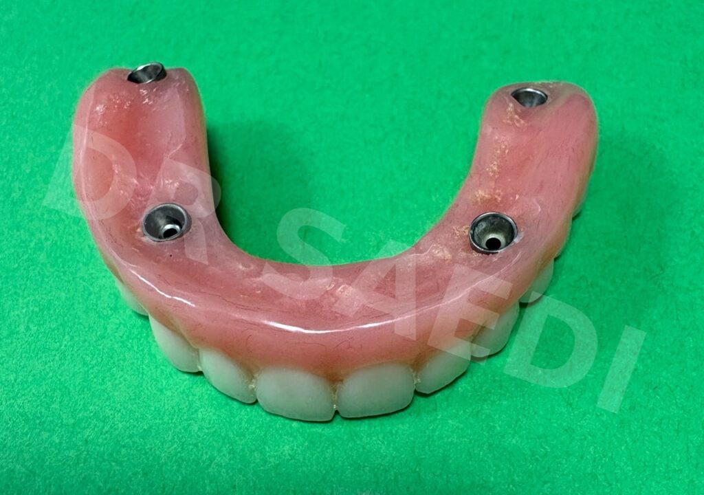Four implants are strategically placed in the jaw to maximize support.